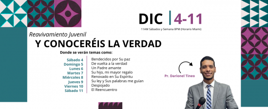 El Lic. Darionel Tineo, estará en la Semana de Reavivamiento titulada “Y conocereis la verdad”. Esta se estará llevando a cabo del sábado 4 al sábado 11 de diciembre.